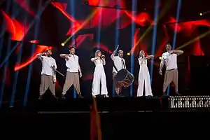 The Greek performance featured five of the members of Argo performing together on stage with a male dancer; the female members were dressed in white outfits, while the male members were dressed in white shirts and light brown baggy trousers.[23][24] The stage presentation featured a lyre player and traditional Pontic dances with the LED screens projecting red flames and sun patterns. The performance was choreographed by Maria Lyraraki with lighting design by Konstantinos Garinis and costumes designed by Yiorgos Mesimeris.[25] For the performance, Argo member Elias Kesides was replaced by dancer Vasilis Roxenos.[26]