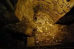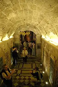 The church is located approximately 650 meters (2,130 ft) from the Basilica of the Annunciation and 130 meters (430 ft) from Mary's Well, which sits alongside the road leading to Saffuriyya. The underground chapel from the medieval era containing the spring is accessed from within the present church by descending seven steps.[7] Measuring 10 meters long, 3.3 meters wide, and 3.5 meters high, at the end of this low vaulted cavern, presumably built by the Crusaders in the 12th century, ancient Armenian tilework decorates the walls leading to a small recess.[11][12] There, below an altar with a semi-circular apse, a shaft leads down to the spring, and one can lower a metal cup to draw water.[11][12] On the wall to the east is doorway, whose entryway is blocked, and it thought that this is the stairway to which Quaresmi referred in his writings.[12]