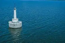 The light, situated about 9 miles (14 km) from the Fox River,[4][7][9][10] marks the west side of the entrance that leads to the city of Green Bay on the north side of the dredged shipping channel.[6] Federal funds were allocated in 1934 to replace the aging Peshtigo Reef Light with the Green Bay Harbor Entrance Light.[3][11] The work of constructing the light was started in 1935.[7][11]