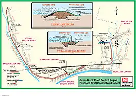 To address this flooding problem, the United States Army Corps of Engineers has proposed the Green Brook Sub Basin Flood Control Project, which entails numerous flood walls, levees, channel diversions, widening projects and retention basins throughout the Green Brook basin.[1]