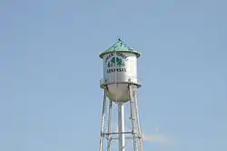 The Green Forest Water Tower is a historic water tower, located near the junction of South Springfield and East Second Streets in Green Forest, Arkansas. It consists of a metal supporting structure with four legs and cross bracing, supporting a water tank with a bowl-shaped bottom, with a water pipe in the center of the structure connecting the tank to the water system. The tank was built in 1937 by the Chicago Bridge and Iron Works Company with funding from the Public Works Administration. It is the only known surviving PWA-funded tower in Carroll County.[2]