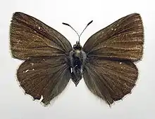 Callophrys rubi has a wingspan reaching about 26–30 millimetres (1.0–1.2 in) in length.[3] The oversides of the wings are a uniform dull brown, with two paler patches on the male's forewings made up of scent scales.[1] The undersides are a bright green with a thin white line, often reduced to a faint row of dots or even missing altogether. The iridescent green colour of the undersides is a structural colour caused by diffraction and interference of light by microscopic repeating structures forming a diffraction grating in the wing scales.[4] The caterpillars are green with yellow markings along the back.[1] Like other members of the family they are rather sluglike.