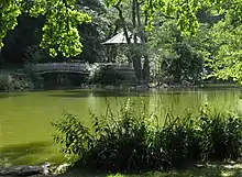 The Möslepark, created as a landscape park between 1879 and 1885 under the plans of urban gardener Maximilian Wilhelm Schmöger, is one of the oldest parks in Freiburg. Initially, in 1877, two artificial ponds had been created south of the train tracks for the collection of ice by the brewery Neumeyer.[9] (A former public house of the brewery can still be seen at the corner of Schwabentorring and Kartäuserstraße today.) The Society for Urban Beautification (Verein zur Verschönerung der Stadt), founded in 1873, suggested the creation of the park shortly afterwards. The park owes its name to its abundance of water. The oldest well houses of the city spring can be found here. In 1881, a third pond was created, which merged with the first two, and created the lake Waldsee as we know it today. The Waldseerestaurant, which is situated on the western bank of the Waldsee, was founded in 1883 and features a terrace next to the lake. It is still a very popular vacation restaurant, as well as a place for local events. After the First World War, the extremely unkempt park, which covers an area of 11,000 m2 (i.e. eleven hectares), was thinned out and slightly remodeled. In 2015, the western part of the park was pruned, and in 2016 the eastern part will be as well, in order to restore the former variation of thick and light areas.[10]