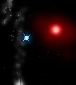 In astronomy, a green star is a white or blueish star that appears greenish in some viewing conditions (see § Psychology below). Under typical viewing conditions, there are no greenish stars, because the color of a star is more or less given by a black-body spectrum.[1] However, there are a few stars that appear greenish to some observers, due to the viewing conditions, for example the optical 'illusion' that a red object can make nearby objects look greenish (and vice versa). Some multiple star systems, such as Antares, have a bright reddish star where this contrast makes other stars in the system seem greenish.