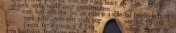 A document written at Garðar in Greenland in 1409 is preserved in an Icelandic transcription from 1625. The transcription was attested by bishop Oddur Einarsson and is considered reliable. The document is a marriage certificate issued by two priests based in Greenland, attesting the banns of marriage for two Icelanders who had been blown off course to Greenland, Þorsteinn Ólafsson and Sigríður Björnsdóttir. The language of the document is clearly not Icelandic and cannot without reservation be classified as Norwegian. It may have been produced by Norwegian-educated clergy who had been influenced by Greenlandic.[7] The document contains orthographic traits which are consistent with the runic linguistic evidence. This includes the prepositional form þil for the older til which demonstrates the merger of initial 'þ' and 't'.[8]