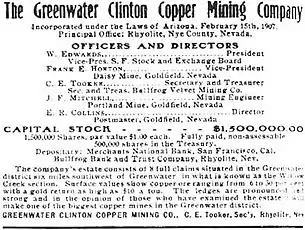 Greenwater's many copper mining companies were first mentioned on public records on the 4th of May, 1906. The last mentioned copper company in record books was mentioned on the 1st of September, 1909.[9] The copper companies in Greenwater failed due to the fact that there were so many different companies in such a small area (56 total listed). Of the 56 different Copper companies listed, four were exposed as fraudulent companies.[9] This further points to the failure of the companies, since there was such congestion mixed in with fraudulent leaders, there was a fall in the companies.