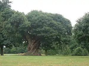 On the upper level, there is an extensive flower garden complete with large duck pond, a rose garden, a cricket pitch, many 17th-century sweet chestnut trees with gnarled, swirling trunks, tennis courts, a bandstand, Roman remains, an ancient oak tree (known as Queen Elizabeth's Oak, associated with Queen Elizabeth I)[8][9] and an enclosure ('The Wilderness') housing some wild deer.
