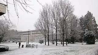 The campus boast 3 000 trees,[33] including Arboretum Robert Ruffier-Lanche with over 250 different species of trees and shrubs from around the world. Due to its rich vegetation, surrounded by Isère (river), in proximity of three mountain chains, and in immediate adjacency to the city, the campus is known for student quality of life. The university is ranked among the most beautiful universities and campuses in France[34] and Europe.[35][36] The campus has a rich network of public transport, including the Grenoble tramway, several bus lines, easy access the main highway and a network of bike lines. Grenoble is traditionally recognized as one of the best student cities in France.[37][38][39][40]