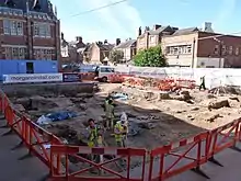 The friary is best known as the burial place of King Richard III who was hastily buried in the friary church following his death at the Battle of Bosworth. An archaeological dig in 2012/13 successfully identified the site of the Greyfriars church and the location of Richard's burial.[4] The grave site was incorporated into the 'Dynasty, Death and Discovery' museum which opened in 2014. In December 2017 Historic England scheduled the site.[5]