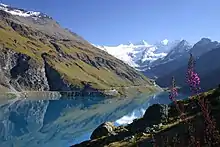 Lac de Moiry is a reservoir completed 1958. Lac des Autannes is located at an elevation of 2,686 m (8,812 ft). Grimentz lies at 1,620 m (5,310 ft) altitude above sea level.