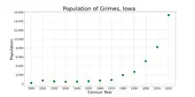 Grimes is a city in Dallas and Polk counties in the U.S. state of Iowa. The population was 15,392 at the time of the 2020 Census.[3] Grimes is part of the Des Moines metropolitan area.