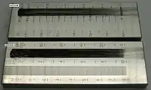 A grindometer is a device used to measure the particle size of suspensions, typically inks such as those used in printing, or paints. It consists of a steel block with a channel of varying depth machined into it, starting at a convenient depth for the type of suspension to be measured, and becoming shallower until it ends flush with the block's surface. The depth of the groove is marked off on a graduated scale next to it. The suspension to be tested is poured into the deep end of the groove, and scraped towards the shallow end with a flat metal scraper. At the point where the depth of the groove equals the largest particles in the suspension, irregularities (for example pinholes in an ink sample) will become visible.