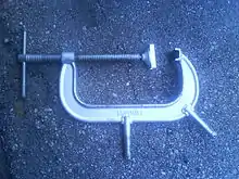 - Bar Clamp (Furniture Clamp) – A clamp with two jaws attached to a bar that can be used to mount a small light fixture. One jaw is fixed to the bar and the other can be adjusted with a screw mechanism. Often used on set along with a bar clamp adapter.