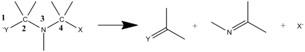 3-aza-Grob fragmentation is variation which takes place when an electrofuge and nucleofuge are situated at positions 1 and 5 on a secondary or tertiary amine chain with the nitrogen at the 3 position.[8][9] The reaction products are an electrofugal fragment, an imine, and a nucleofugal fragment (such as an alcohol).