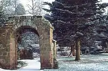 In the park are three medieval arches moved from elsewhere in the city, both of which are listed at Grade II. St Mary's Arch with its wing walls dates from around the 13th century and formerly stood in St Mary's Benedictine Nunnery.[11][16] The Old Shipgate Arch formerly stood to the west of the Bridgegate and was taken down in 1831.[11][17] The third archway was removed from St Michael's Church.[18][19] Also in the park and listed at Grade II is Jacob's Well Drinking Fountain consisting of a small stone arch with a drinking fountain for people and a dish for their pets, which is now dry.[11][20] During the laying out of the park a long line of Roman earthenware water pipes was discovered close to the lodge which used to bring fresh water from Boughton to the Roman fortress. In the 1950s a rockery was constructed on the southern edge of the park with waterfalls, streams and fountains.[11] The main gates of the park, together with other gate piers and sections of the park walls, all designed by John Douglas, are listed at Grade II.[21][22][23][24]