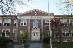 In the late 1920s the building was extensively altered, adding the three wings, and removing the third floor of the original building, which had been damaged by fire in 1925. Exterior changes also gave the building its present Colonial Revival appearance. Despite significant alterations in use to accommodate different grades over the years, the building's interior also remained remarkably intact. In 1975, the town joined with neighboring Dunstable, and its high school students were relocated to the Groton-Dunstable Regional High School. This building was renamed the Colonel William Prescott School, and house lower grades until it was closed in 2008.[2]