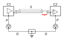 Another less common source of ground loop currents, particularly in high power equipment, is current leaking from the "hot" side of the power line into the ground system.[2][7] In addition to resistive leakage, current can also be induced through low impedance capacitive or inductive coupling. The ground potential at different outlets may differ by as much as 10 to 20 volts[3] due to voltage drops from these currents. The diagram shows leakage current from an appliance such as an electric motor A flowing through the building's ground system G to the neutral wire at the utility ground bonding point at the service panel. The ground loop between components C1 and C2 creates a second parallel path for the current.[7] The current divides, with some passing through component C1, the signal cable S ground conductor, C2 and back through the outlet into the ground system G. The AC voltage drop across the cable's ground conductor from this current introduces hum or interference into component C2.[7]