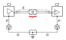 A hazardous technique sometimes used by amateurs is to break the "third wire" ground conductor P in one of the component's power cords, by removing the ground pin on the plug, or using a "cheater" ground adapter. This creates an electric shock hazard by leaving one of the components ungrounded.[3][4]