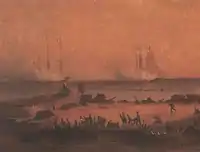 Guadalupe Victoria engaged in the battle in the Juego de Pelota, which was surrounded by a moat that insurgent soldiers did not dare to cross; Guadalupe Victoria threw his sword across the moat and said ¡Va mi espada en prenda, voy por ella![20] (There goes my sword as pledge, I'm going for it!). He swam across the moat and cut the rope of a bridge to allow the insurgent troops into the city.[13]