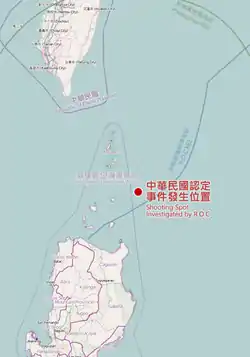 The incident occurred in the overlapping exclusive economic zones between Taiwan and the Philippines. The site of the incident is 43 nautical miles east of Balintang Island according to the Philippine Bureau of Fisheries and Aquatic Resources[16] and 170 nautical miles south of Taiwan according to Taiwan's Ministry of Foreign Affairs, both well within the 200 nautical mile range prescribed by the United Nations Convention on the Law of the Sea.[17] An exception to the 200 nautical mile rule occurs when exclusive economic zones would overlap; that is, state coastal baselines are less than 400 nmi (740 km) apart as it was in this case. When an overlap occurs, it is up to the states to delineate the actual maritime boundary.[18] Generally, any point within an overlapping area defaults to the nearest state.[19]