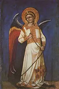Guariento's major commissions in Padua include the choir frescoes for the Augustinian hermits' church of the Eremitani, which depict scenes from the life of St. Augustine,[1] the order's founder. Painted in 1338, the cycle was severely damaged by the bombardment of 1944. Guariento also decorated the chapel of the Palazzo Carrara in Padua with panel paintings of the Madonna, St Matthew Evangelist and 25 angels. After the reconstruction of the palace in 1779 the panels were transferred to the Museo Civico of Padua. The decoration of the chapel is the subject of a recent study by Kornelia Mohl.[2]