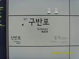 Gubanpo Station is a station located at 1053 Banpo-dong, Seocho-gu, Seoul. It opened on July 24, 2009 with the opening of Phase 1 of Seoul Subway Line 9 (Hangul:수도권 전철 9호선) . It is the 25th station from the starting/ending point, Gaehwa, and is 4 stations from Sinnonhyeon Station, the last station of Phase 1. It is 1.0 km from Dongjak Station, which is a transfer station with Line 4. It is also 1.5 km from Express Bus Terminal Station, where you can transfer to Lines 3 and 7.