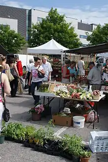 The Guelph Farmers' Market has served as a cultural and commercial anchor in downtown Guelph since the first Market House was built in 1827.[1] After 180 years it is still going strong and remains a popular stop on Saturday mornings for both locals and visitors. The Guelph Farmers' Market's website proclaims "Buy Local - Buy Fresh", reflecting the growing trend to "eat where you live" which is supported by local,[2] national, international organizations and popular opinion.