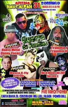 The Guerra de Familias tournament paid respect to the fact that wrestling is a family tradition in Lucha libre, with a large number of second and third-generation wrestlers following the footsteps of their relatives and becoming wrestlers themselves.[3] For the tournament IWRG's definition of "Family" included by actual blood relationship, storyline family relationship and one team where the team name included the word "Family". Los Traumas (Trauma I and Trauma II) were legitimately related to each other, both sons of wrestler Negro Navarro and had been a regular tag team since 2002.[3] wrestlers Heavy Metal and Danny Casas represented the "Casas Family", although it has never been officially confirmed if Danny Casas is an actual member of the family or if it is a fictional ring name he is using.[3] The Los Junior Dinamitas team of Cien Caras, Jr. and Hijo de Máscara Año 2000 were not actually related although in the fictional storylines of Lucha Libre they were supposed to be cousins, as Hijo de Máscara Año 2000 is the son of Máscara Año 2000 while Cien Caras, Jr. paid Cien Caras for the use of the character but is not related to him.[4] The fourth team represented a group called La Familia de Tijuana ("The Family from Tijuana"), but Eterno and Mosco X-Fly are not related, nor did they promote them as actually being related.[5] IWRG did not put a specific prize up for the winner of the tournament nor promoting it as the winners would receive a match for the IWRG Intercontinental Tag Team Championship, especially since Trauma I held the championship with his father at that point in time.[6]