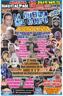 IWRG announced 16 participants for the annual Guerra del Golfo ("Gulf War", referring to the Gulf of Mexico, not the middle eastern wars.) on April 14, 2018. IWRG regulars El Ángel, Carta Brava, Jr., Danny Casas, Chico Che, Dinamic Black, Apolo Estrada, Jr., Eterno, Factor, Mosco X-Fly, Oficial 911, Trauma I, Trauma II and Veneno were all included in the match.[1] The Guerro del Golfo event would also include Dragon Gate trainees Eita and Tomahawk and lone AAA representative Toscano rounded out the match.[1] In the annual Guerra del Golfo wrestlers face off in Steel cage matches with the loser of the first two steel cage matches being forced to fight each other in the final match of the night. The losing wrestler in the final would be forced to either unmask (if masked) or have their hair shaved off (if not masked) under the Lucha libre rules of a Lucha de Apuesta, or "Bet match". Carta Brava, Jr., Dinamic Black, Trauma I and Trauma II were all masked going into the match while the other 12 competitors were putting their hair on the line. The first "loser advances" steel cage match would include Toscano, Mosco X-Fly, Oficial 911, El Ángel, Veneno, Apolo Estrada, Jr., Tomahawk and Trauma II, while the second "loser advances" match included Factor, Carta Brava, Jr., Chico Che, Eterno, Dinamic Black, Eita, Trauma I and Danny Casas.[1] The first two cage matches would be contested under "escape" rules, which meant that a wrestler would be eliminated when that person was able to climb up the cage and put at least one leg over the top. The last person in the ring would be deemed the loser and would have to compete in a match where pinfalls and submissions would also win the match. In past IWRG steel cage matches under similar stipulations wrestlers not officially announced in the match have interfered, climbed in the cage to help someone or attack someone. This interference made the unannounced wrestlers eligible for the "loser advances" stipulation as well. The most blatant case of this scenario came at the 2012 Guerra del Golfo event where the final match turned from a one on one match to a three on three match involving all three members of Los Oficiales and all three members of Los Oficiales Elite who were involved in a long running storyline at the time.[2][3]