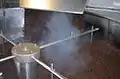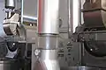 2nd stage (Roasting): Through the computer system a certain quantity of green coffee is taken away from the silo and put in a toasting machine. Inside those machines, there is a rotating drum that, warmed from a methane furnace, at a temperature of about 240 to 300 degrees Celsius, roasts it. It takes about 15–20 minutes. During this process the physical and chemical characteristics of the beans change. The beans blow up, grow in volume and leave behind the aromatic principles and oils. It is this process that gives coffee its taste and scent. After the roasting the coffee is put in the hopper and cooled down by sending a cold breeze through the airshaft. Through another airshaft the same breeze is recycled to the combustion. The roasting coffee is introduced in one of the two silos through an elevator with cups for the storing.