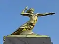 The sculpture features two bronze pieces. In the front is a bust of Marconi (approx. 40 x 30 x 16 in.) which sits on a rectangular Stony Creek granite base (approx. 95 x 32 x 18 in.).[4] Behind the bust is the second bronze resting on another granite base (approx. 95 x 72 x 36 in.). The second bronze is an allegorist female figure sitting on a globe with her legs stretched out behind her. She points her proper left arm straight in front of her while her proper right arm is raised and bent at the elbow. She is naked with a small piece of drapery on her lap. According to Piccirilli she is "the Wave", representing "Marconi's contribution to science..."[4]