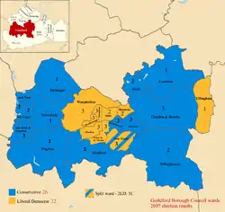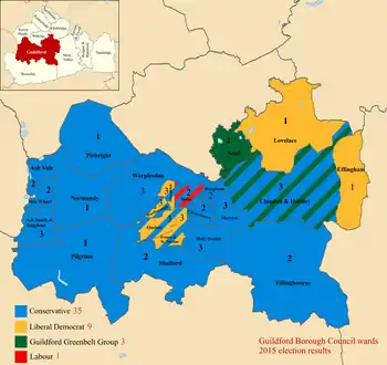 Wards electing councillors of more than one party – Friary and St Nicolas (3 – 2 Con, 1 Lib); Holy Trinity (2 – 1 Con, 1 Lib); Tillingbourne (2 – 1 Con, 1 Ind)
