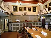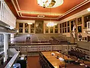 The Chamber still retains may of its features from the time it served as a courtroom having a bench for the Justices' at its South side together with similar side-benches and two square mobile boxes on rollers for the accused and witnesses. Above the side benches are short galleries for ladies and the grand jury while at the North side is located tiered seating for the general public. In front of the bench is a large table for the clerk and lawyers.[1]