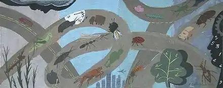 In 1965 Ramos-Poquí was awarded a fellowship from the French Government to work in Paris and was given a studio at the Cité internationale des arts in Paris[3] where he held an exhibition of collages featuring photo cut-outs, graffiti and letter/number transfers. Although these 1965 collages have a post-Pop Art feel, their employment of a personal code and incorporation of mechanical, automatic and lyrical formal elements defy categorisation. His 1967 work, exhibited in the Gallery of the Institute of North American Studies in Barcelona, consisted of a series of minimalist 'signs' made with industrial spray paint. Ramos-Poquí was granted the American Elias Ahuja Art Specialist Fellowship to New York, where he had a studio from 1967 to 1968.[4]