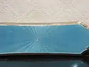 Guilloche describes a narrow instance of guilloche: a design, frequently architectural, using two curved bands that interlace in a pattern around a central space. Some dictionaries give only this definition of guilloche, although others include the broader meaning associated with guilloché as a second meaning. Note that in the original sense, even a straight line can be guilloché, and persons using the French spelling and pronunciation generally intend the broader, original meaning.[10][11][12] Translucent enamel was applied over guilloché metal by Peter Carl Fabergé on the Faberge eggs and other pieces from the 1880s.[13]