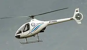 While working at Eurocopter on the Eurocopter AS365 Dauphin and Eurocopter EC120 Colibri helicopters during the 1980s, Bruno Guimbal decided to independently pursue the development of a two-seat reciprocating engine helicopter.[2][3] This rotorcraft would incorporate numerous safety-related and general technological advances commonly applied to larger turbine-powered rotorcraft, but typically absent from reciprocating-engine helicopters.[4] These technologies included Eurocopter's Fenestron anti-torque shrouded tail rotor and Spheriflex main rotor, in addition to a composite fuselage.[5]