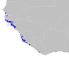 Guinean mangroves can be found: in the Saloum River and Casamance deltas in Senegal; in the lower Gambia River basin; much of the coast of Guinea-Bissau, including the Cacheu and Mansoa Rivers; across the border in northern Guinea; and much of the coast of Sierra Leone including the Sherbro River. Mangroves thrive on flat coastal inlets and estuaries where the ocean tides wash warm salt water high upriver, in this ecoregion as far as 100 km, for example in the Cacheu River of Guinea-Bissau.[2][3]