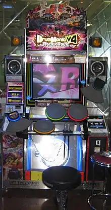 DrumMania (ドラムマニア, Doramumania) is a drumming music video game series produced by Bemani, the musical division of Konami Digital Entertainment, Inc. It first released in 1999 as an arcade game, then subsequently ported to the Sony PlayStation 2 in Japan in 2000 as a launch title. Subsequent mixes have been released approximately once a year. In 2010, a series XG was introduced, adding a floor tom, left cymbal and a left pedal to the cabinet setup. To focus on the new game, development ceased for the original version, with the last mix V8 released in 2011.