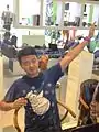 Yang Eryeniu (杨二耶牛), a Miao batik artist, was born in Yangwu village in Danzhai county in Qiandongnan. Yang Eryeniu's name is patronymic: Yang is her Han surname, Er is her name meaning phoenix, Ye is her father's name meaning stone and Niu is her grandfather's name meaning bronze drum. When she was eight she first started leaning the art of batik from her mother, which was thirty years ago. Batik Art is an ancient handicraft from the ethnic groups in China's southwest mountain regions. Yang Eryeniu's drawings are full of creativity and draw on themes from her ethnic culture. Given a wax knife and a small pot of melted beeswax she can create on a white cloth all different kinds of drawings, such as: an elegant butterfly, a lively fish and a lifelike Miao phoenix...her strokes follow her heart and the wax follows her strokes in a smooth process of drawing.[4][5][6]