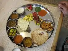Gujarati thali prepared in Gujarati households has at least three fresh vegetable dishes, one dry dal or some sprouted pulses dish (ugaadayla mung, for instance), a wet dal, kadhi, kathor (a savoury), mithai, poori, rotis, steamed rice, chaash and papad.[4]
