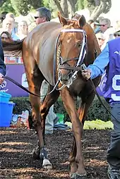 Gun Runner is a chestnut stallion with a small white star and one white sock bred in Kentucky by Benjamin Leon Jr.'s Besilu Stables.[3] His sire is Candy Ride, an Argentinian-bred horse who was undefeated in a six race career that included four Grade I wins in Argentina and the United States. Although expectations for Candy Ride at stud were initially low, he proved himself a successful sire whose offspring include champion Shared Belief.[4] Candy Ride was among the top five sires in North America four times, including a second-place finish in 2017.[4][5]