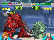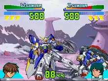 Gundam: Battle Assault is a fighting game similar to Gundam: The Battle Master set in the Mobile Suit Gundam Wing storyline.[1][2][3][4][5] It features two modes: Story and Versus.[1][6] The plot involves Heero Yuy, protagonist of Gundam Wing and pilot of the XXXG-01W Wing Gundam, on a mission to destroy remaining enemy Mobile Suits under command of Treize Khushrenada to stop a war from starting, with players being able to select from nine mechs to battle against enemies in story mode.[4][6] The gameplay system from The Battle Master was changed to resemble a more traditional fighting title;[1][3][5][6] the temperature and special gauges were replaced with a standard health bar (of which each mobile suit has three), a boost gauge and an ammo counter. The shoot and weapon functions are now special moves, being replaced with second strength punch and kick buttons.[2] The health bars works similarly to the temperature bar but when a health bar is empty, the mech will overheat and be knocked down, and overheats leads to a loss.[1][6]