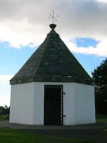 Plans for rebuilding it were made in 1781, at the time of the Napoleonic Wars, and accomplished by 1801; its use was discontinued in 1880.[35] The last use of the building was by Davidson the Ironmonger who stored carbide here for the miners.[36] When the Golffields wash-house was demolished in 1924, its slates were saved by Provost R M Hogg for restoration of the Powder House, a rescue assisted by Rev. Ranken of the Old Parish Church. It was repaired in 1961 and again in 1992 by Irvine Development Corporation.[37] It is an attractive and well built octagonal building topped by a weather cock.