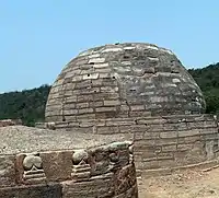 There are remains of structural buildings in brick and stone, including remains of two vihara made of brick, as well as excavated caves at two levels, including an unusual structural chaitya hall (that is, one built above ground). The core of this consists of the stone stupa with an enclosed path around it allowing ritual parikrama (circumambulation). They mostly date to 200-0 BCE, with some sculptures added later. The main building above ground is in brick, around a stone stupa, with over 30 smaller stupas on a terrace in front of it. There are ruins of two other buildings.[4]