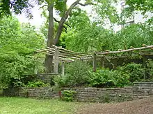 Small seating areas, covered promenade paths, natural stone walls, shrubs, intricate granite stone paths, and a small pond give an almost Mediterranean atmosphere.[3]