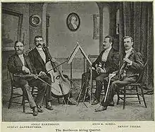 In 1883, Dannreuther formed the Beethoven Club with Carl Meisel (violin), Wulf Fries (cello), and C.N. Allen (viola).[11] The following year, he and Nellie partially moved to New York City and he formed the Beethoven String Quartet, inspired by Boston's Beethoven Quintette Club.[5][3][12] The initial makeup was Dannreuther (violin), Ernst Thiele (2nd violin), Otto K. Schill (viola), and Adolf Hartdegen (cello).[8] By 1886, the Dannreuthers lived fully in New York and in the subsequent years, the group was renamed the Dannreuthers Quartet.[13][3][2] In its first 20 years, the members changed only three times: in 1892, Emil Schenck replaced Hartdegen (cello); in 1895, Joseph Kovarik replaced Thiele (2nd violin); and in 1902, F. Lorenz Smith replaced Kovarik (2nd violin) when Kovarik replaced Schill (viola).[8] At its 20th anniversary, the Quartet was said to be the "oldest and the only 'permanent' quartet, not only in New York City, but in this country."[8] In its 21st year, Henry Hess replaced Smith (2nd violin).[14] Between 1895 and 1910 alone, they performed 14 times at Carnegie Hall[15] and officially disbanded in 1917.[1]