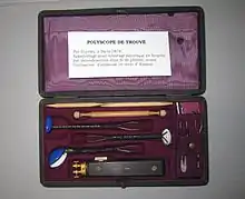 Gustave Trouvé took part in the improvement in communication systems with several noteworthy innovations. In 1872 he developed a portable military telegraph whose cabling enabled rapid communication up to a distance of one kilometer, enabling the swift transmission of both orders and reports back from the Front.[7] In 1874, he developed a device for locating and extracting metal objects such as bullets from human patients, the prototype of today’s metal detector.[8] In 1878, he improved the sound intensity of Alexander Graham Bell’s telephone system by incorporating a double membrane. The same year he invented a highly sensitive portable microphone. Trouvé soon came to be known and respected by his talent for miniaturization. The same year, using a battery developed by Gaston Planté, and a small incandescent airtight bulb, he innovated a "polyscope", the prototype of today’s endoscope.[9]