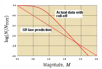 There is an apparent b-value decrease for smaller magnitude event ranges in all empirical catalogues of earthquakes. This effect is described as "roll-off" of the b-value, a description due to the plot of the logarithmic version of the GR law becoming flatter at the low magnitude end of the plot. This may in large part be caused by incompleteness of any data set due to the inability to detect and characterize small events. That is, many low-magnitude earthquakes are not catalogued because fewer stations detect and record them due to decreasing instrumental signal to noise levels. Some modern models of earthquake dynamics, however, predict a physical roll-off in the earthquake size distribution.[11]