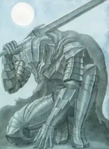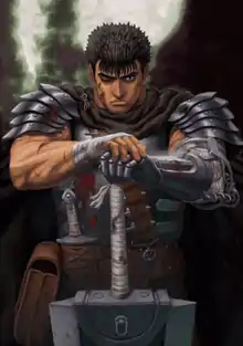 Some aspects of Guts (personality and design) were partially inspired by Miura's highschool friend and later fellow manga artist Kōji Mori, by Mad Max, and by Rutger Hauer's performances in Flesh and Blood, Blade Runner, The Hitcher and The Blood of Heroes.[4][5][6][3] Guts' prosthetic hand was inspired by Dororo's Hyakkimaru and Cobra eponymous protagonist.[7] Kurt, the protagonist of Pygmalio, by Shinji Wada, and an illustration of a giant wielding a sword, featured in The Snow Queen (Guin Saga spin-off), inspired the size of Guts' sword, the Dragon Slayer, by mixing both characters' swords.[8][9]