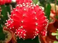 Gymnocalycium mihanovichii is a species of cactus from South America.[2] The most popular cultivars are varied mutants which completely lack chlorophyll, exposing the red, orange, or yellow pigmentation. These mutant strains are often grafted onto the hylocereus cactus, and the combined plant is called a "Moon Cactus".[3][4][5][6] Moon cacti are commonly grown as houseplants and are also known as Ruby Ball, Red Cap, Red Hibotan, or Hibotan cacti.